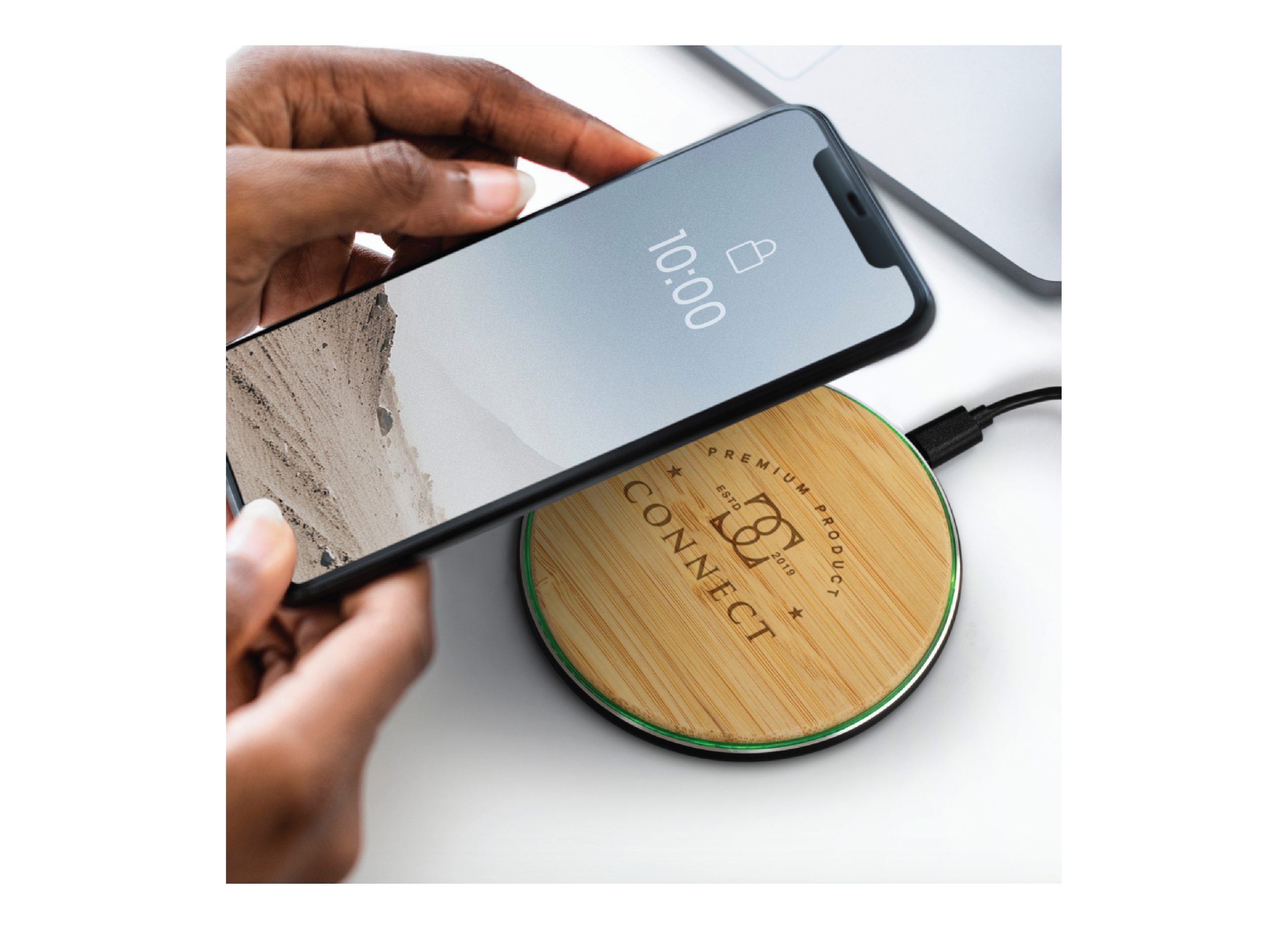 - Natural bamboo charging pad with an aluminium base