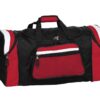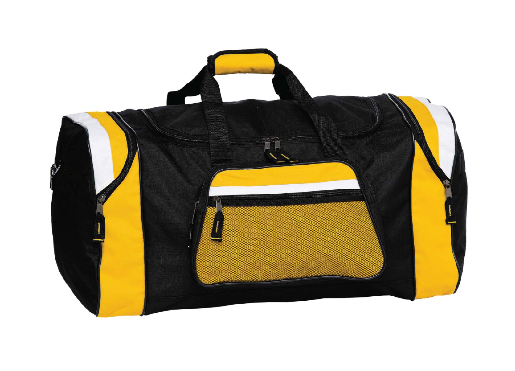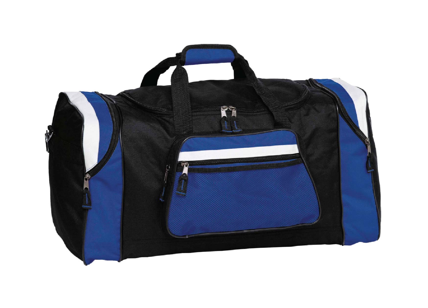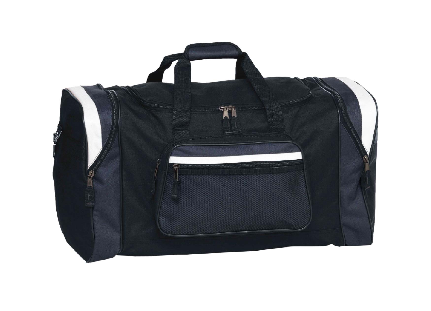 Curved zipper on contrast panel end compartments.