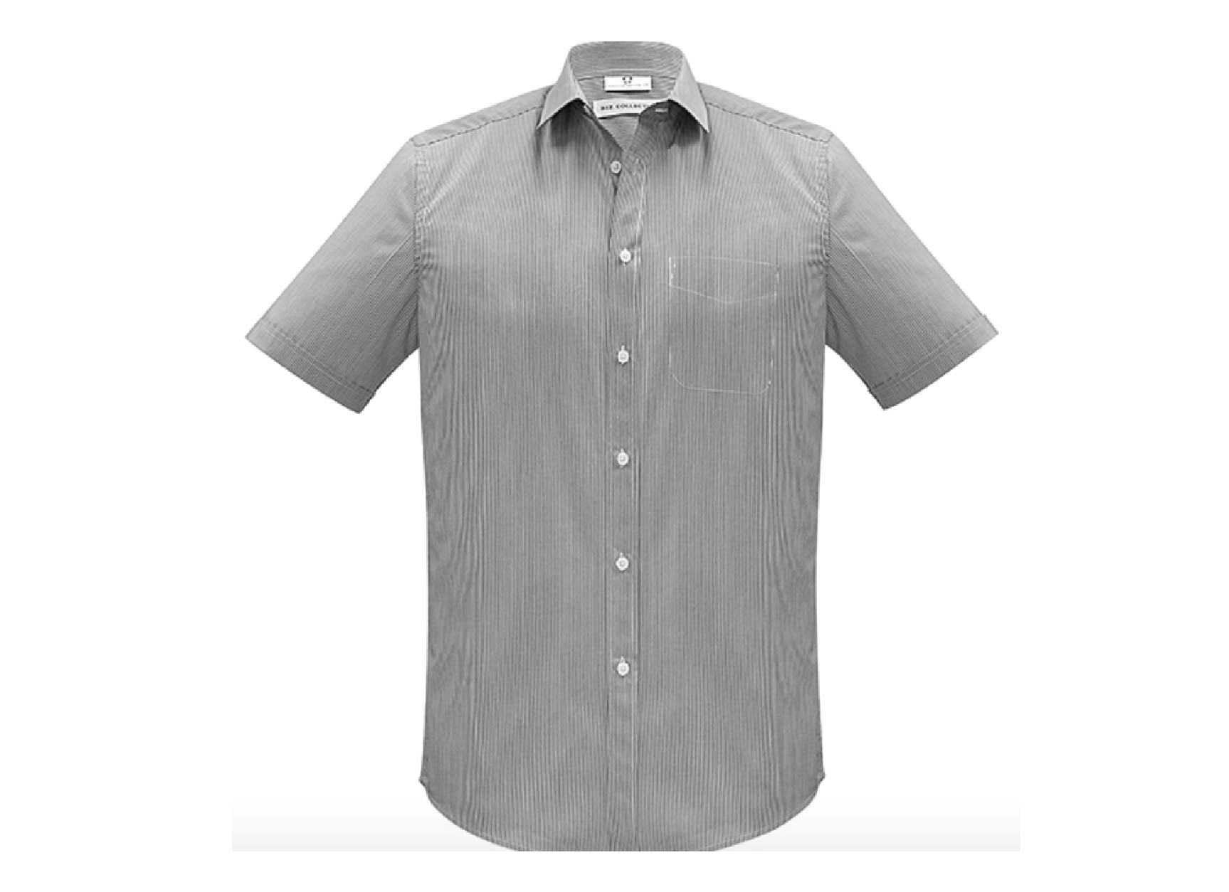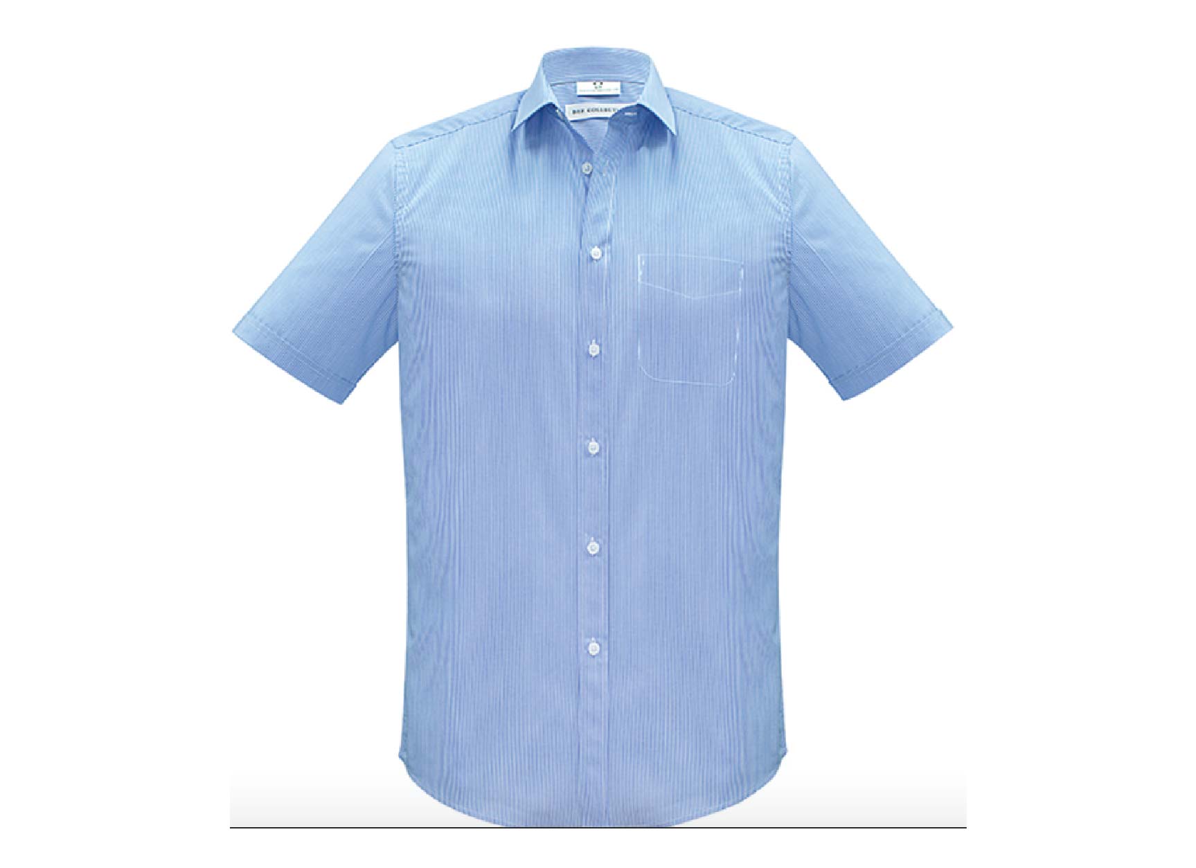 1 colour. Yarn dyed fine stripe business shirt. Modern collar, chest pocket, twin back pleats and adjustable cuff