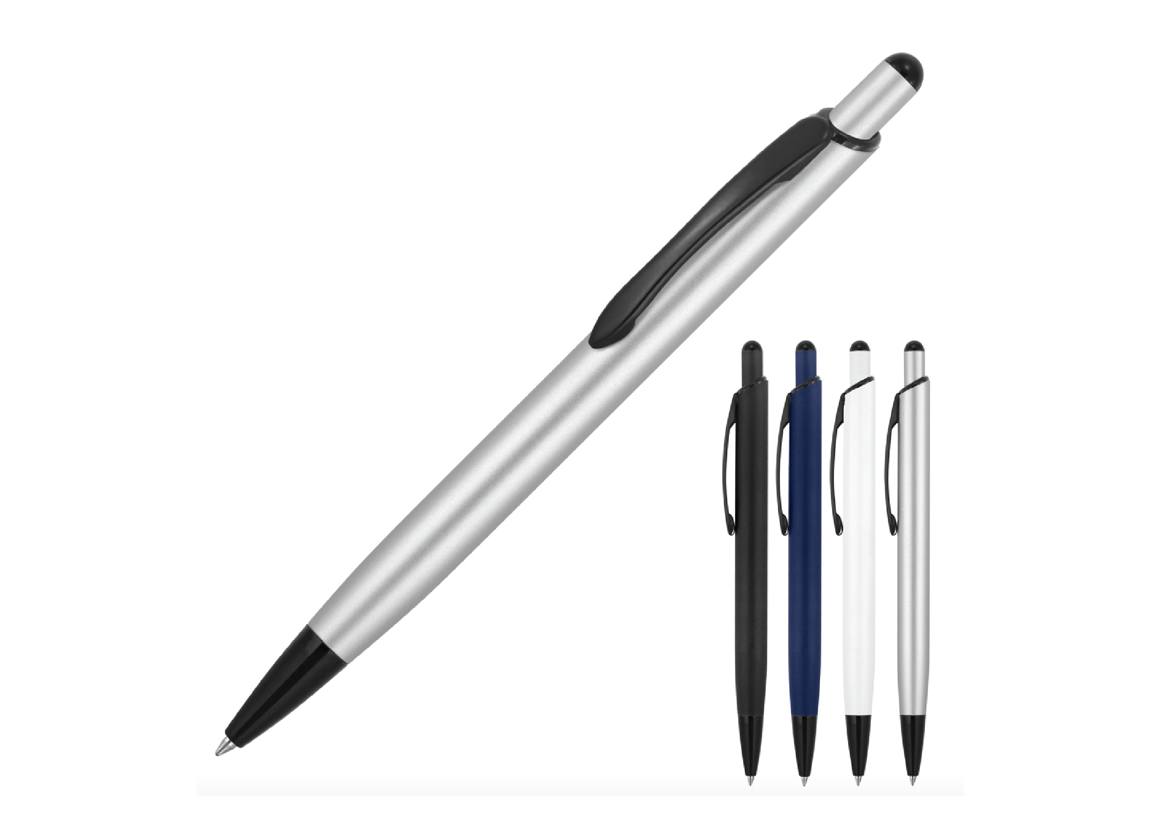 The Bella Matte Black Trim Pen presents a sharp, corporate style with smooth, curved lines. A click action, retractable ballpoint delivers black ink from a smooth, quality black ink medium point Parker type refill