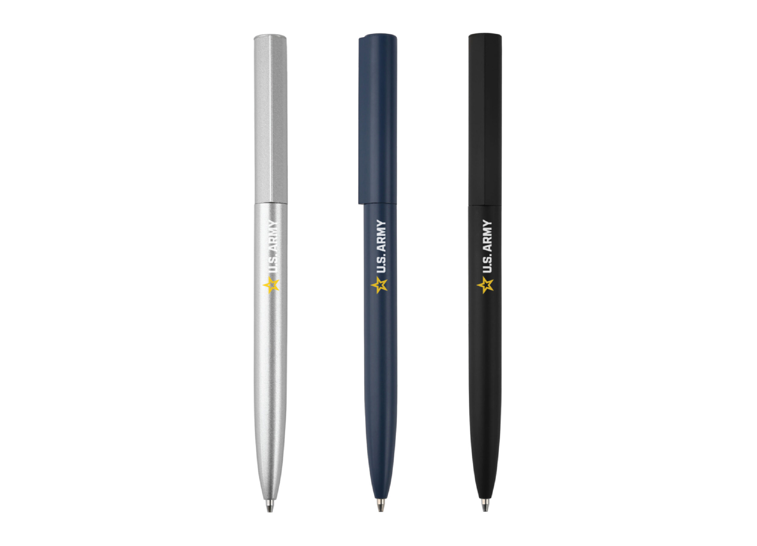 A unique and elegantly designed twist action metal pen with matt finished barrel. Water drop shaped upper barrel stops the pen rolling on a desk.