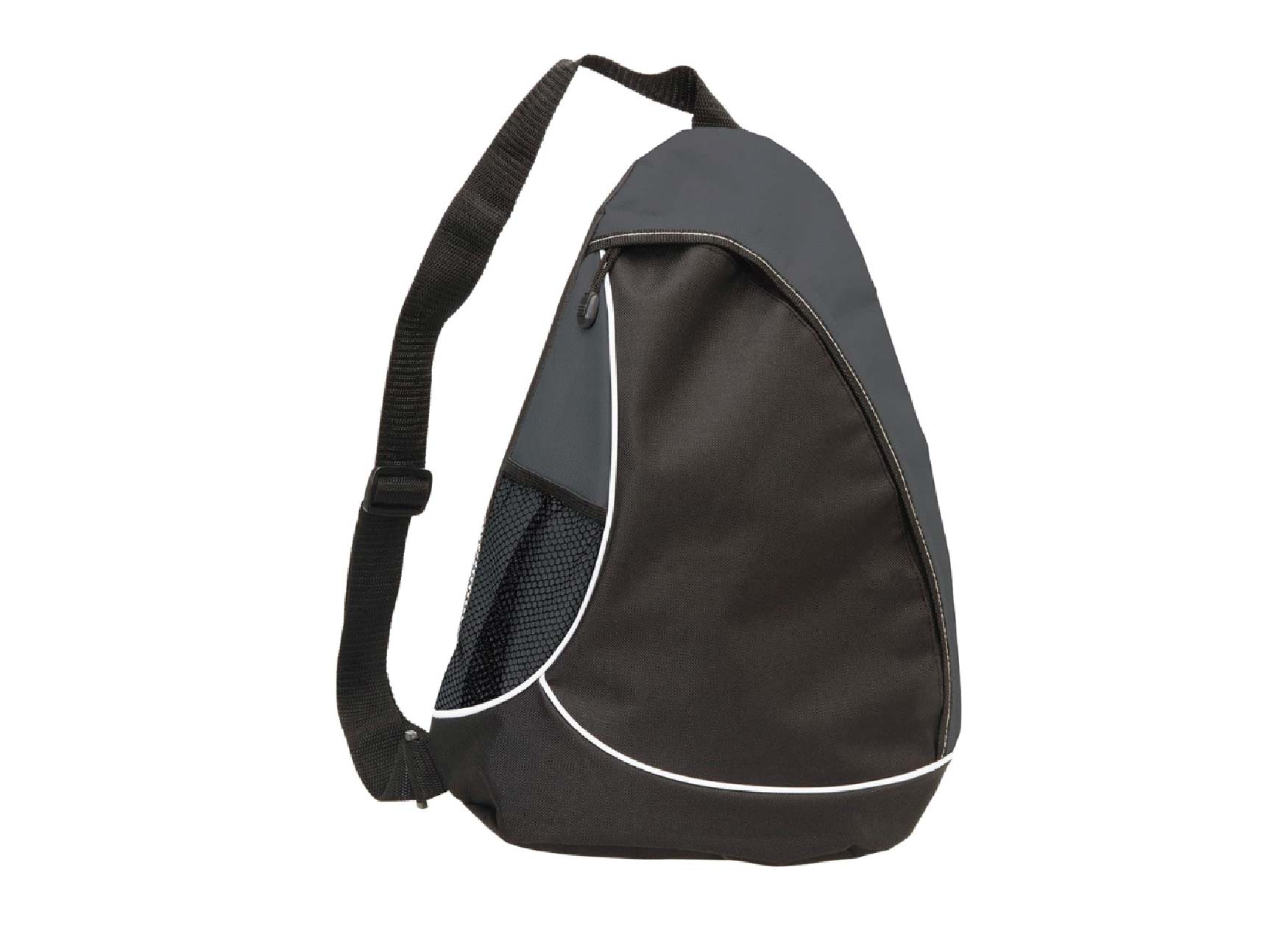 Zippered main compartment with piping accents.