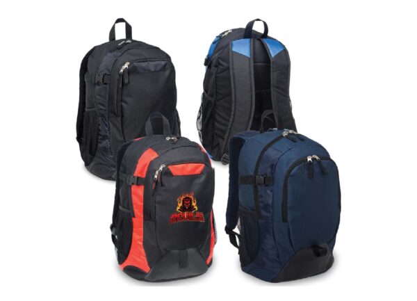 Double zippered front pocket with reflective loops, bungee and toggle.