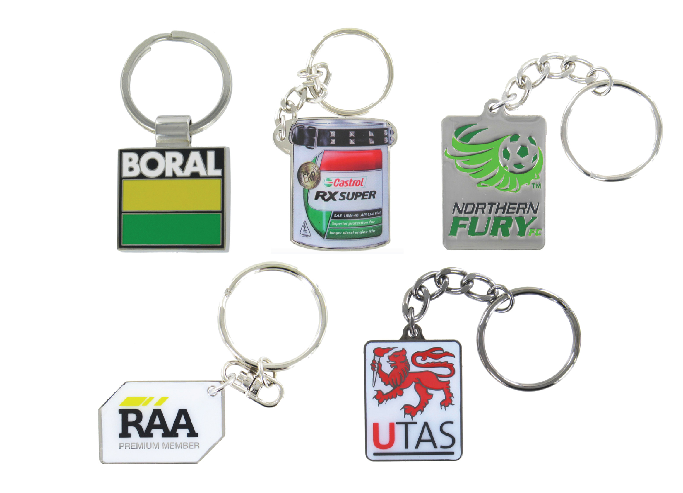 Paint filled or full colour insert custom made metal keyrings. Plated in nickel (silver), gold or bonze with a range of attachments.