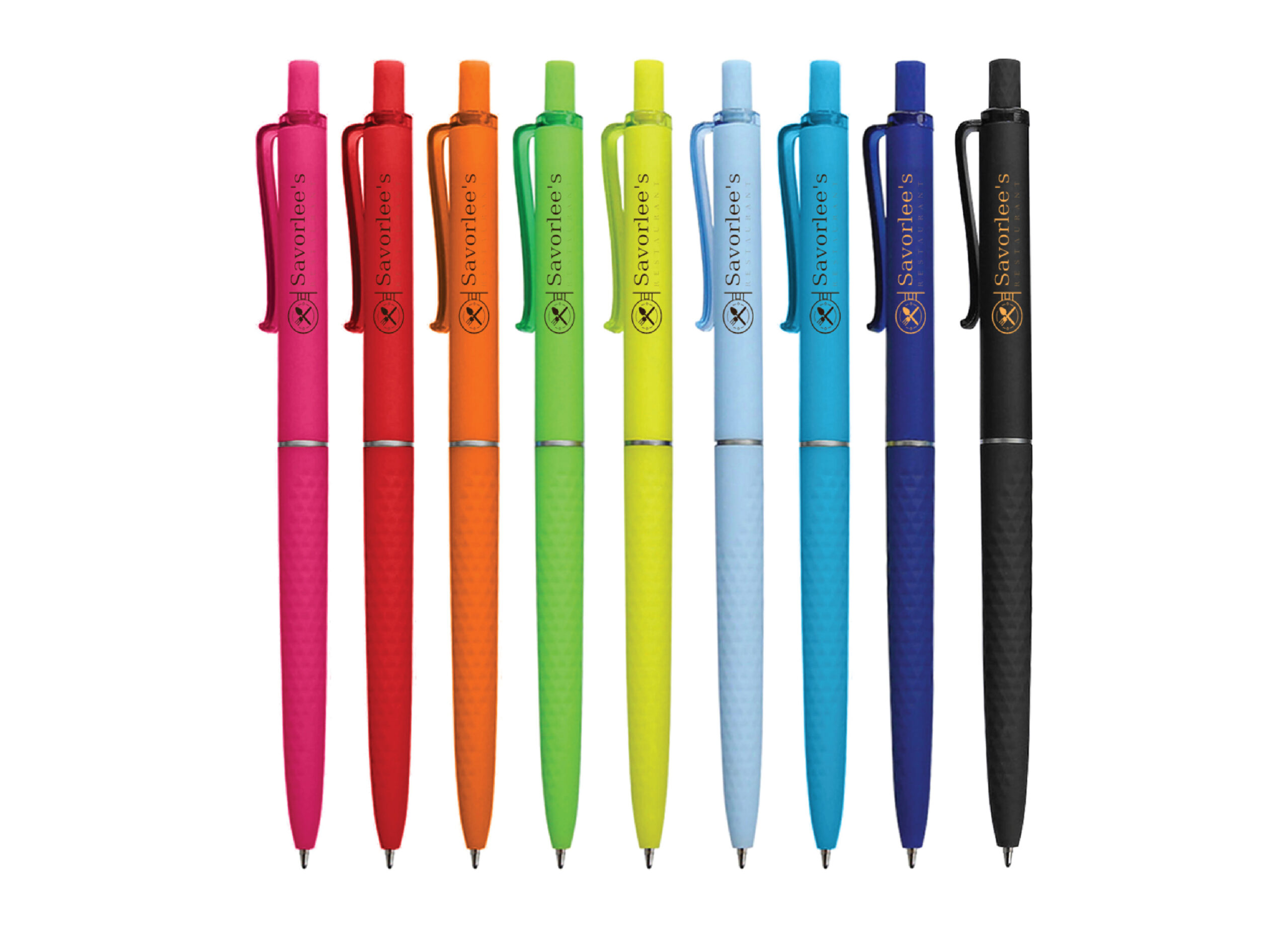 Solid plastic pen with coloured transparent clip. Slim design and textured soft-touch grip satin finish. Click action.