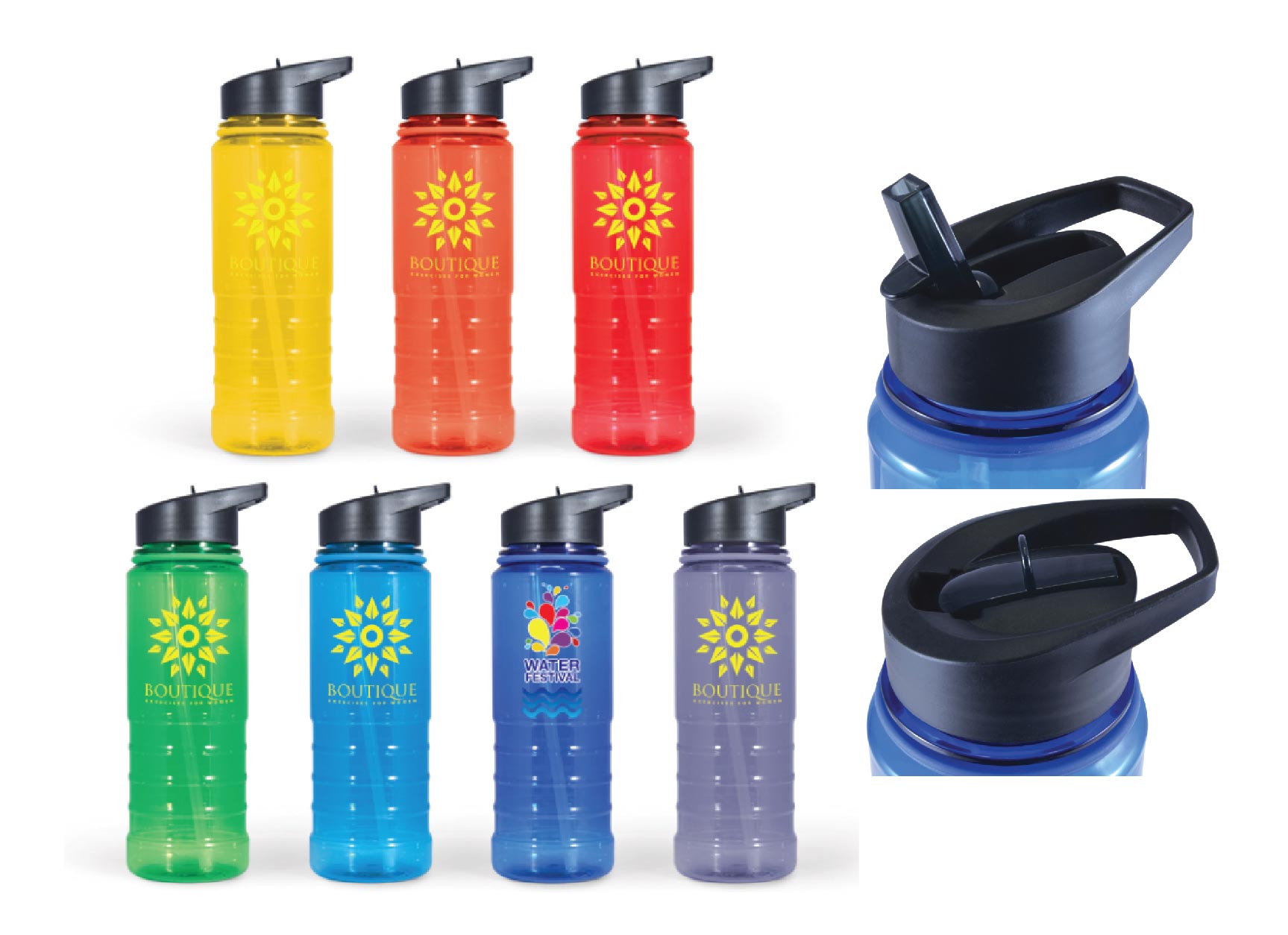 Tritan drink bottle with flip up sip lid and straw. Made from BPA free Tritan. Shatter, odour and stain resistant. This water bottle is intended for cold use only, not suitable for carbonated liquids or freezing. Available in 7 colours.