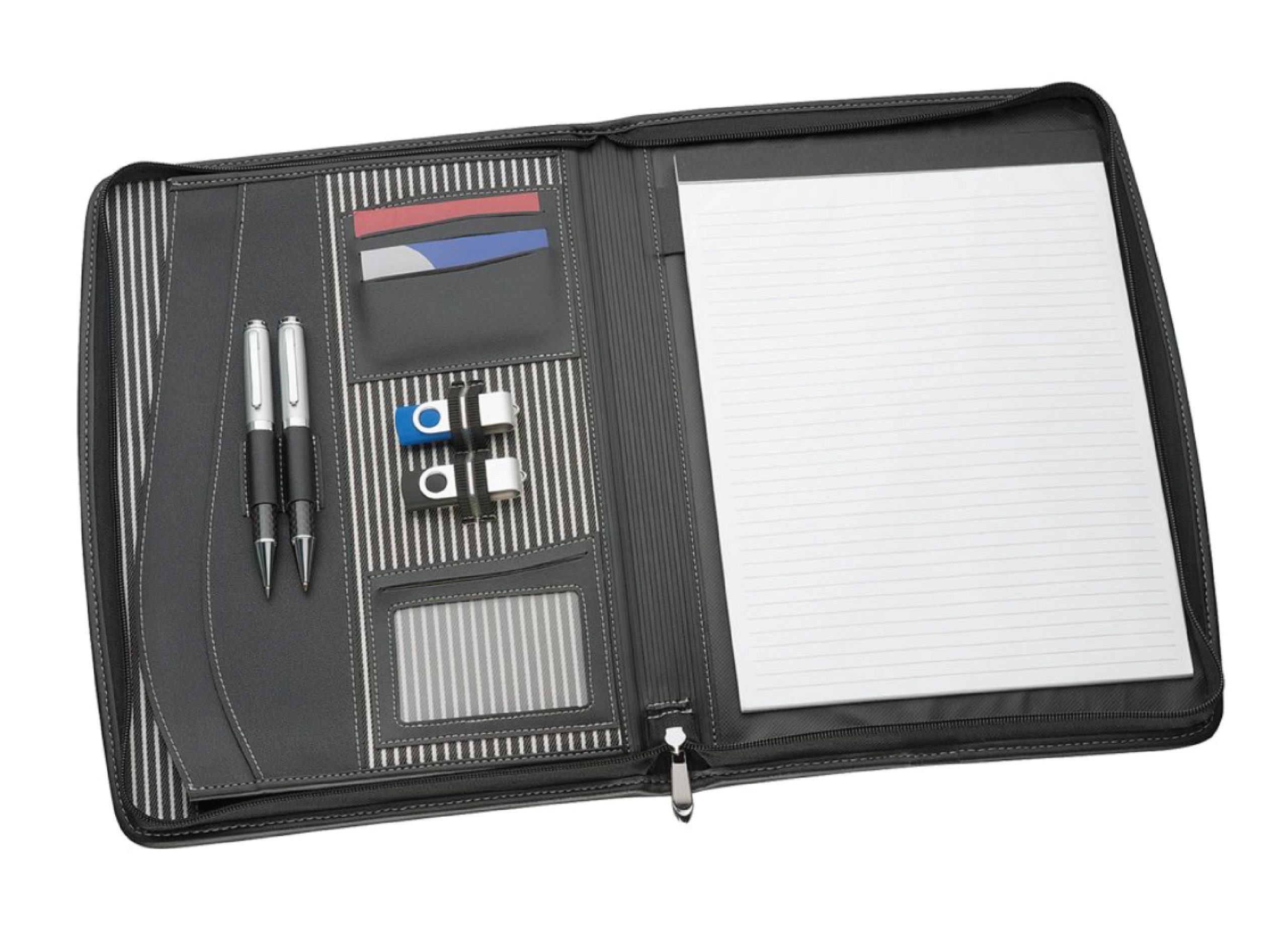 The interior layout includes gusseted pockets pen loops, the USB holders, business card holders, clear pocket and a 25 page white lined pad. Please note that UBS’s and pens not included.