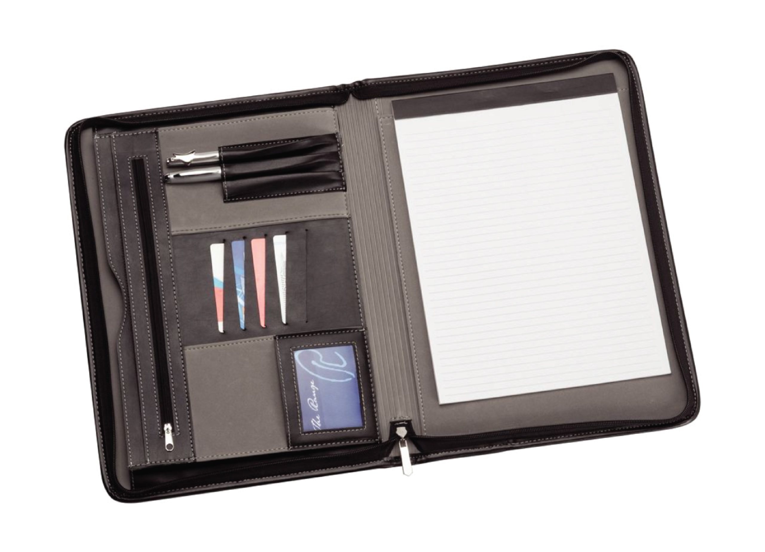 Includes internal gusseted pocket, 3 pen loops, business card holder and white lined pad which inserts from the top. Pens not included