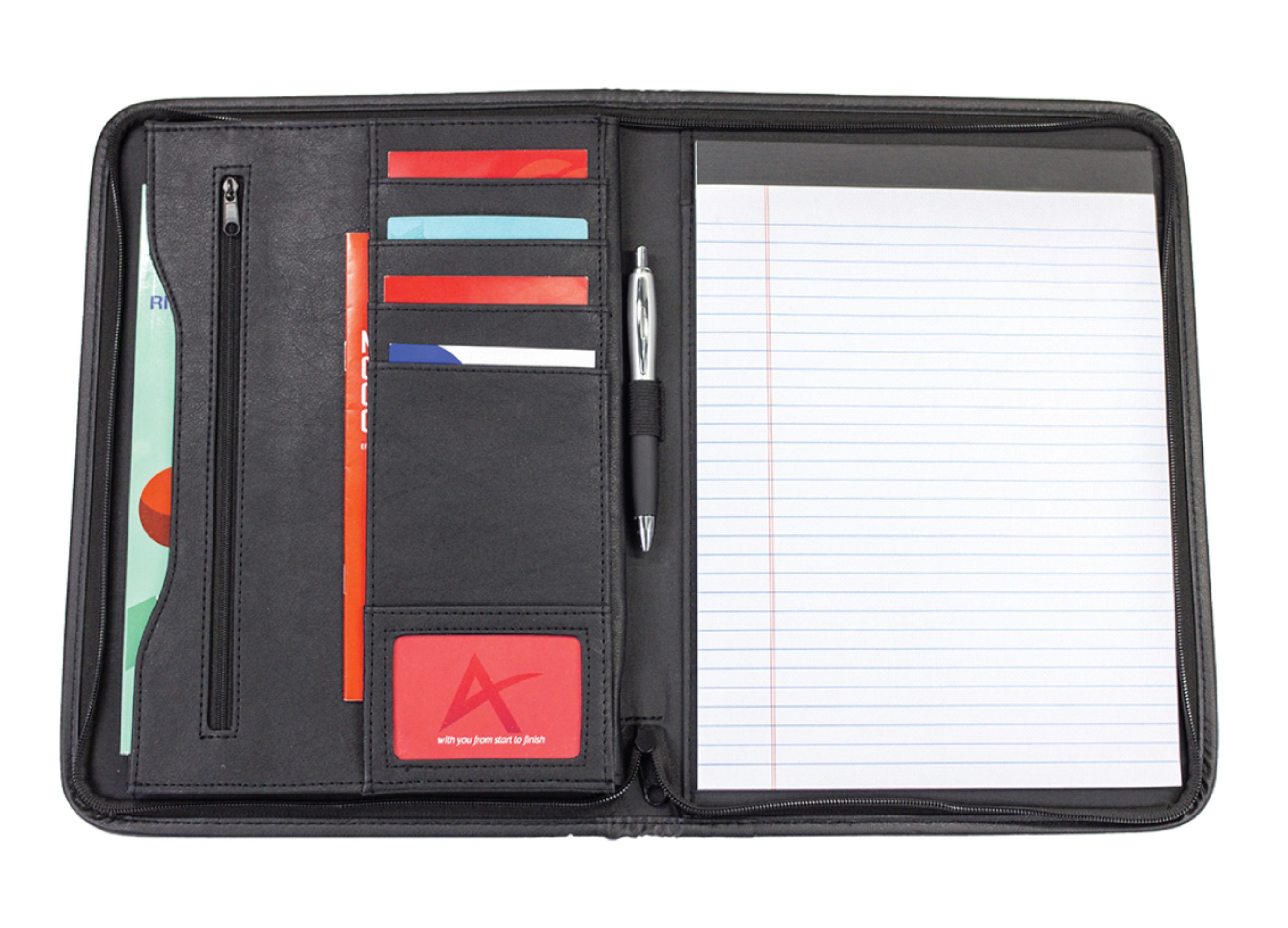 Zippered cover. Includes refillable 30 ruled white page notepad. Front open document pocket. Interior expanding pocket, document pocket, zippered pocket and pen loop. Pen not included.