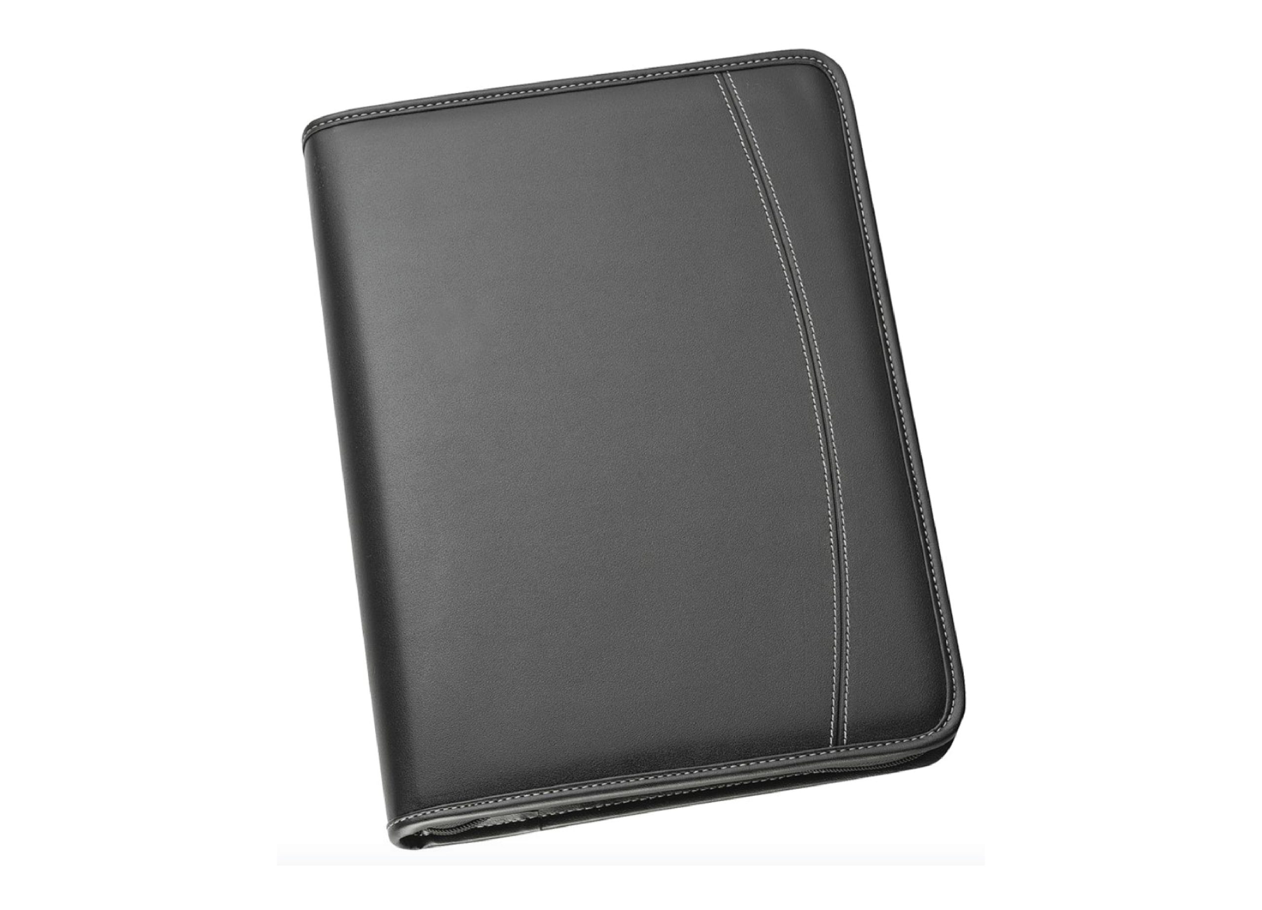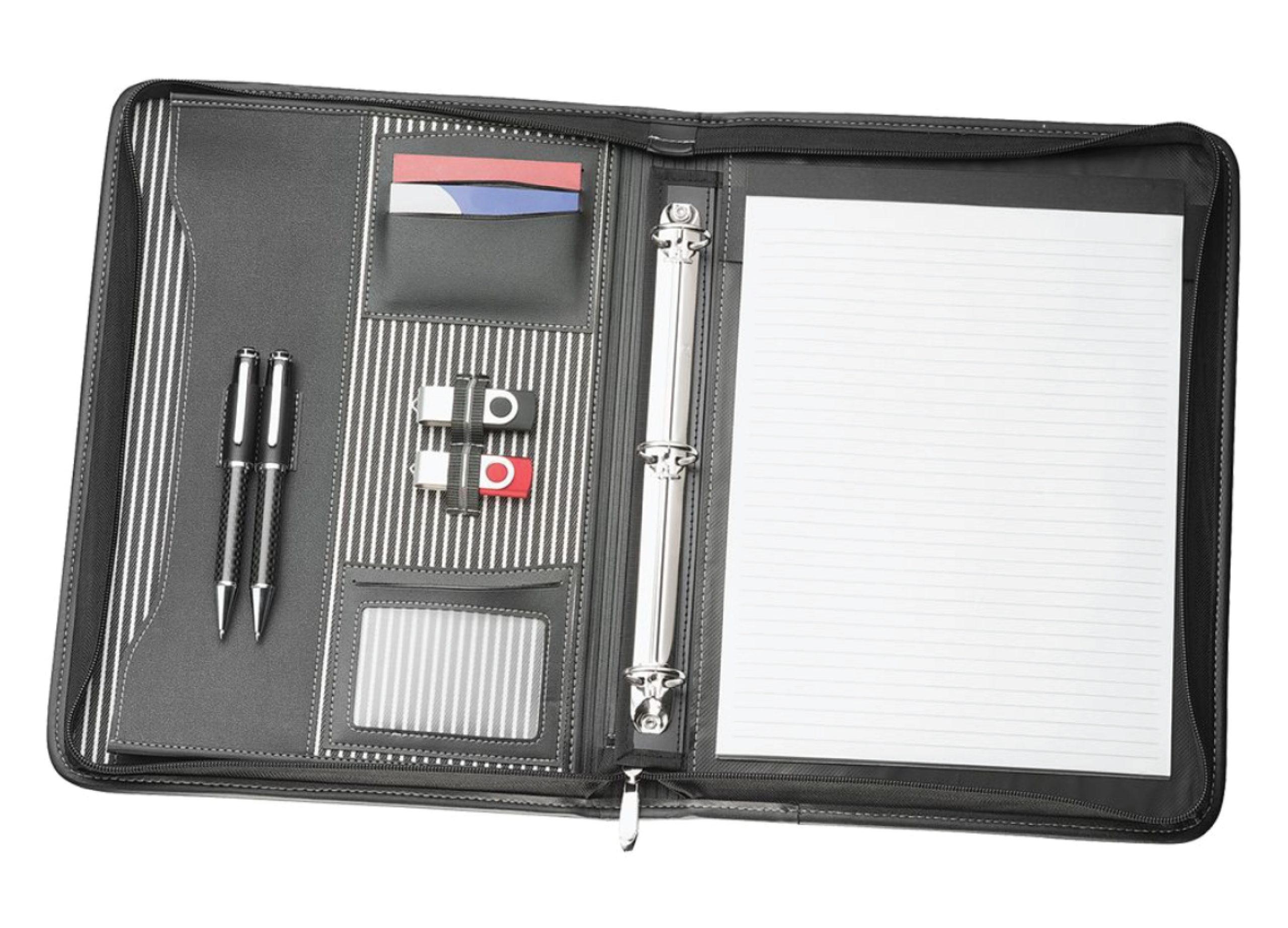 The interior layout includes gusseted pockets pen loops, the USB holders, business card holders, clear pocket and a 25 page white lined pad. Will accommodate a side entry pad. Please note that USB and Pen not included.