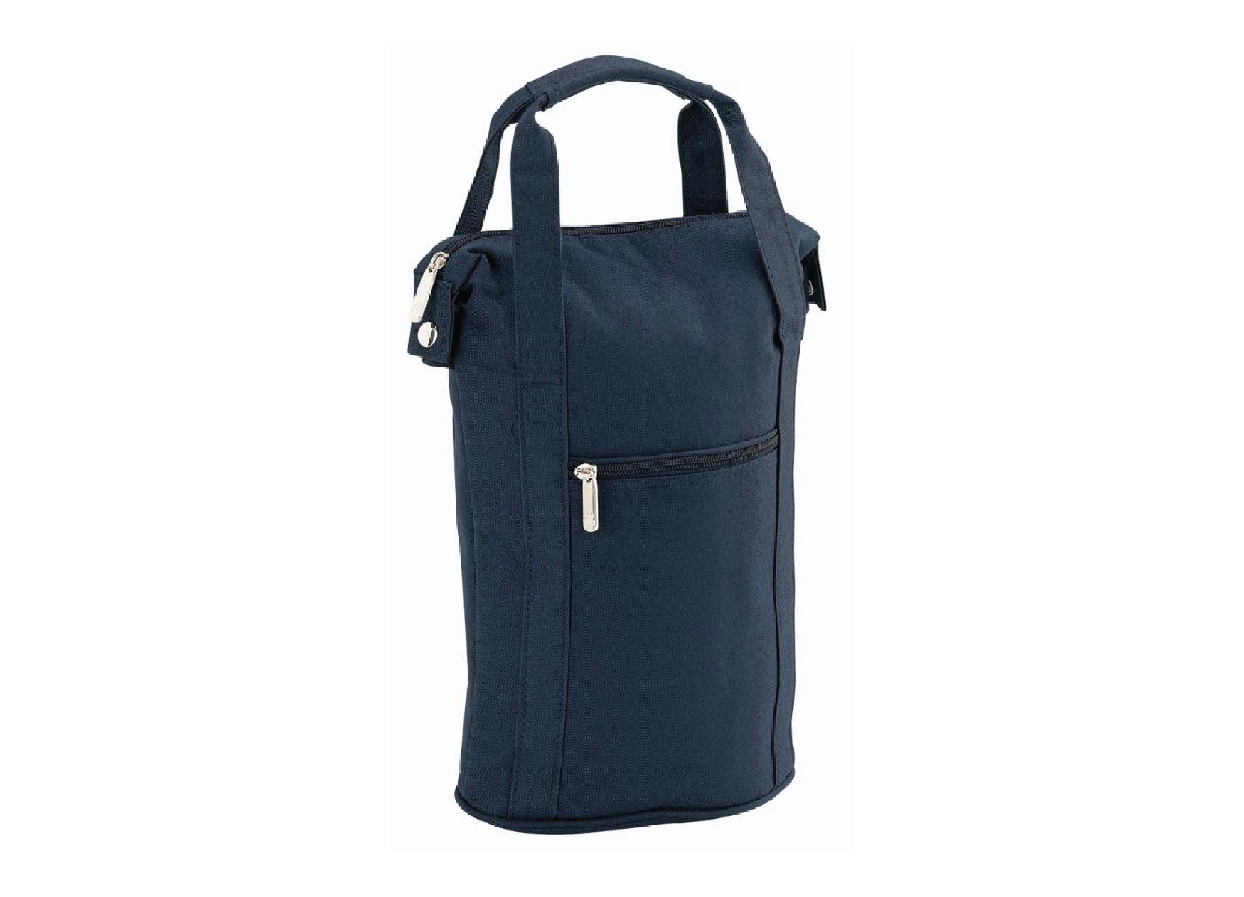 Insulated cooler holds 2 bottles.